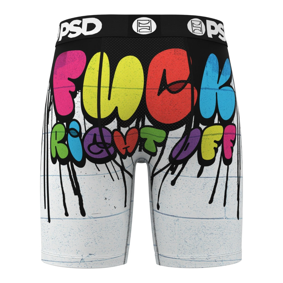 Edgy F Right Off boxer briefs with bold text graphics and premium comfort.