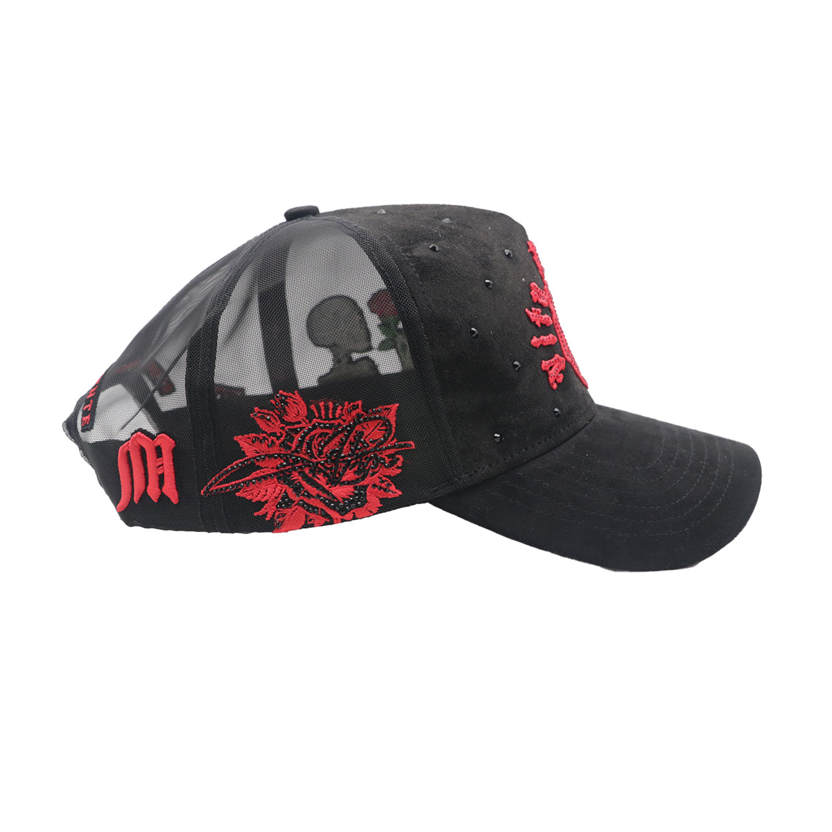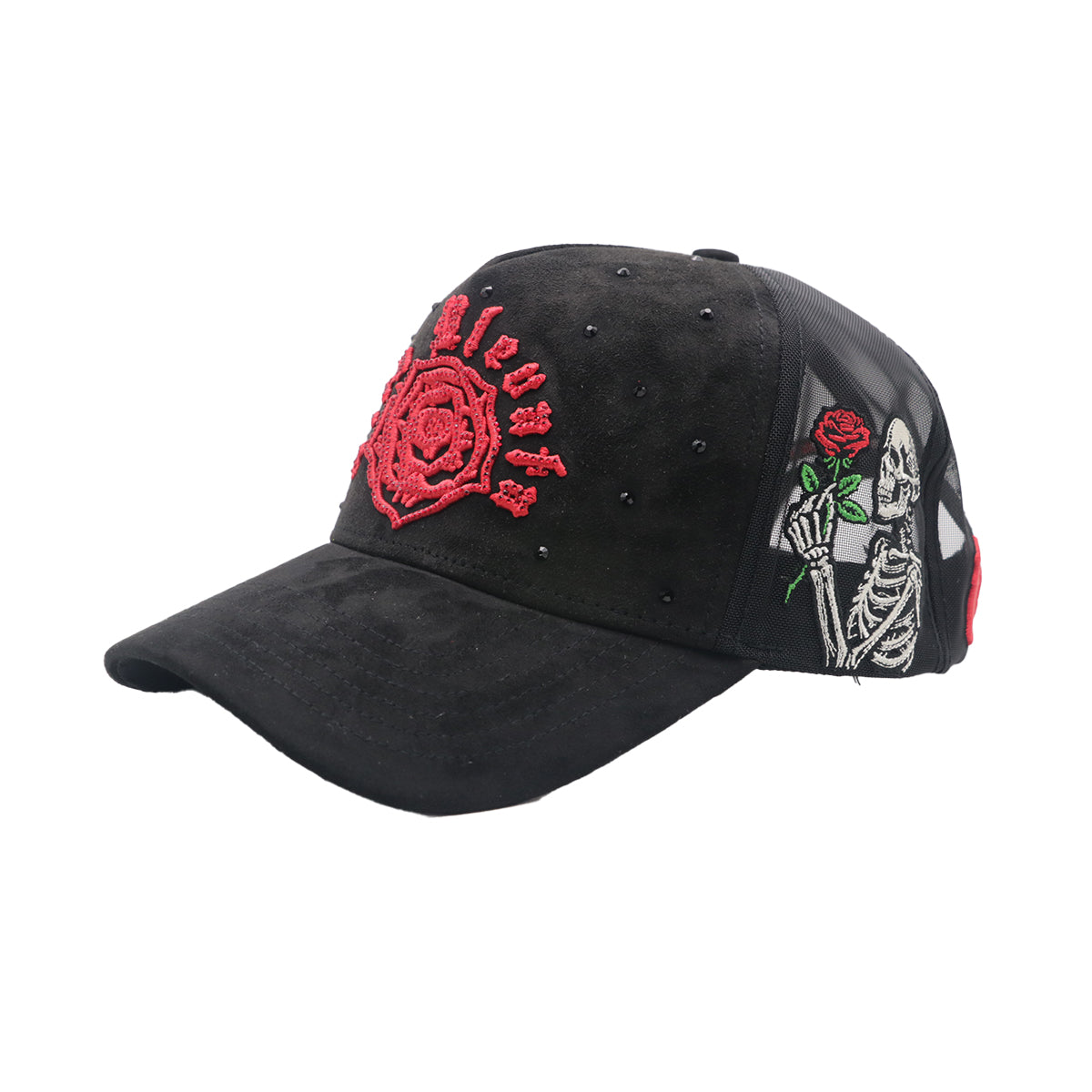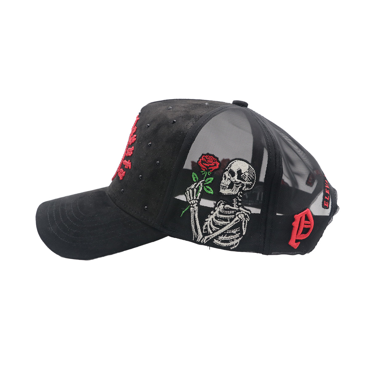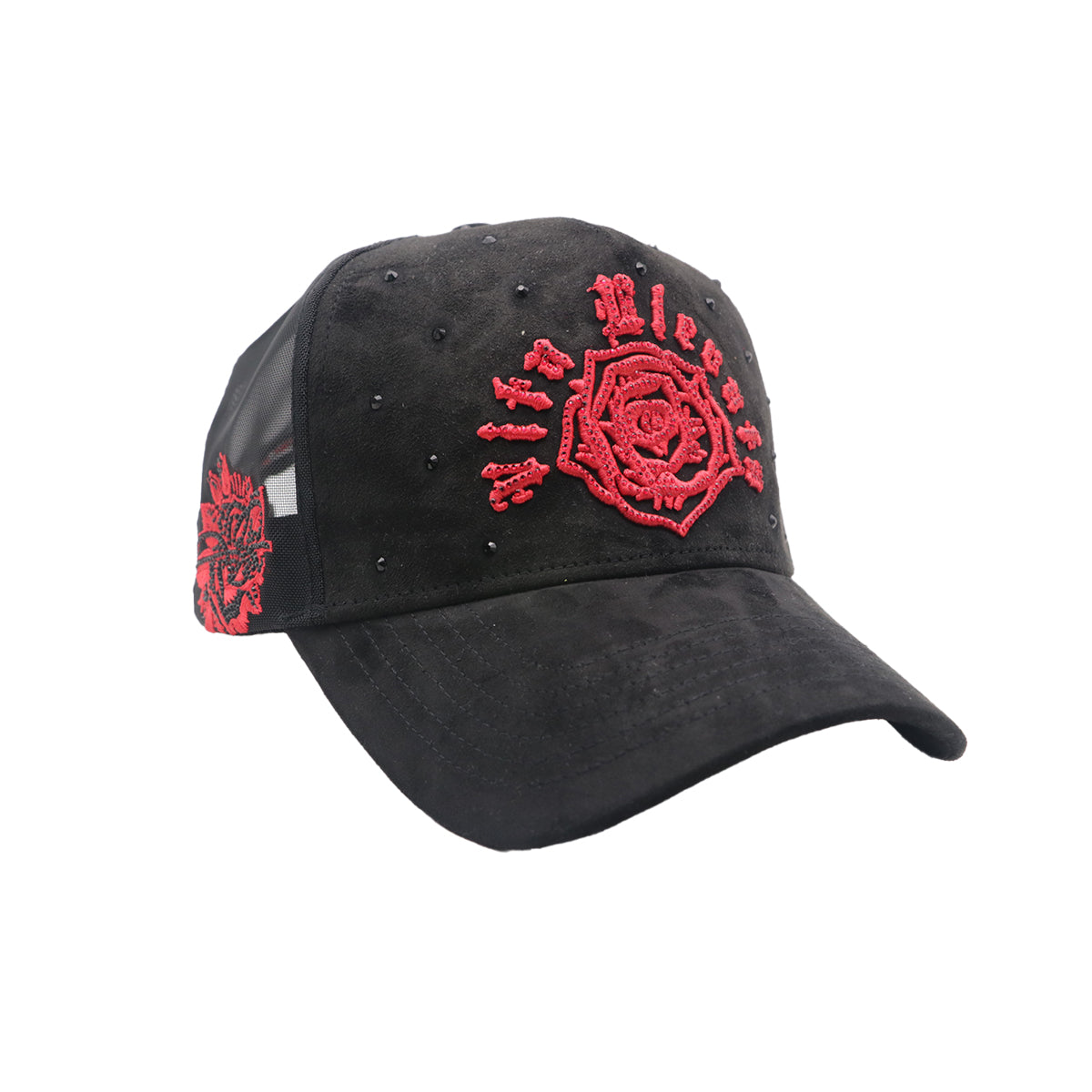 Add a bold yet refined touch to your look with this Stone Rose trucker hat, featuring detailed rose embroidery and gothic-inspired lettering for a standout streetwear aesthetic.