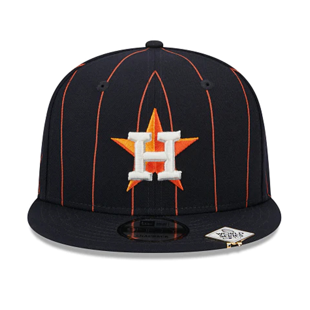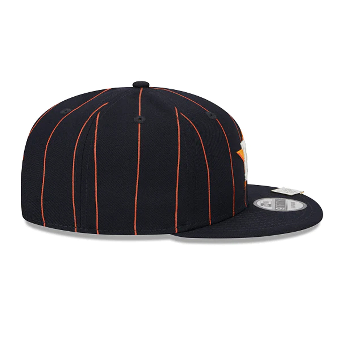 The New Era 9Fifty Snapback Hat MLB Houston Astros Pinstripe Collection, Features Embroidered Team Logo At The Front Panels And A New Era Logo On The Side. It Also Includes A Green Undervisor.