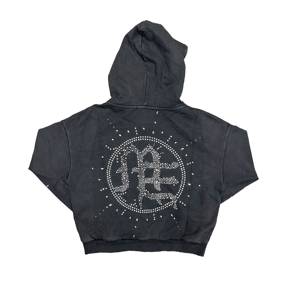 Zip-up hoodie featuring Eclipse-inspired design with acid wash finish for a vintage streetwear look.