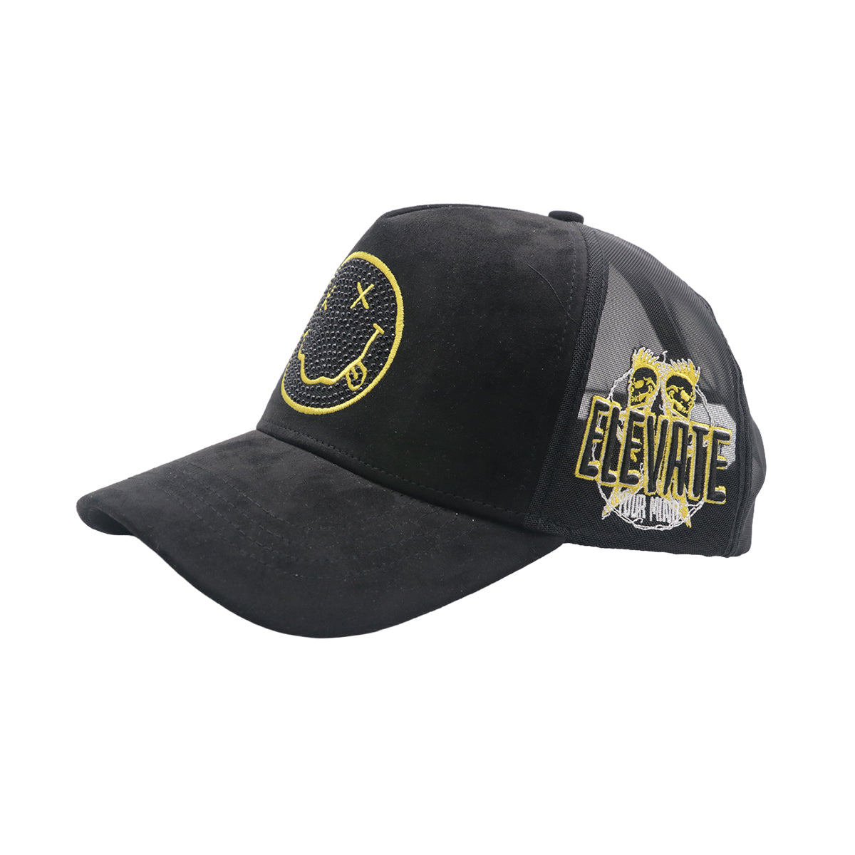 Add playful edge to your streetwear with this Happy Face trucker hat, featuring a bold embroidered graphic that delivers a fun yet rebellious vibe.