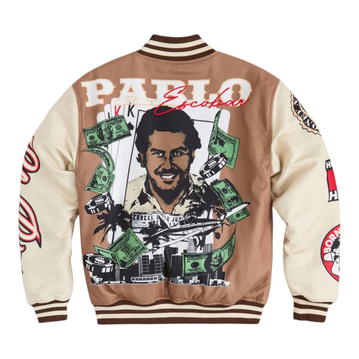 A varsity jacket featuring bold Pablo-inspired graphics, perfect for urban looks.