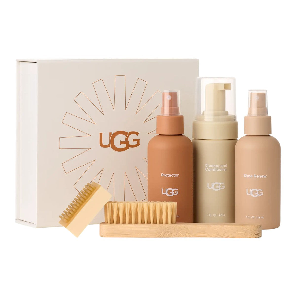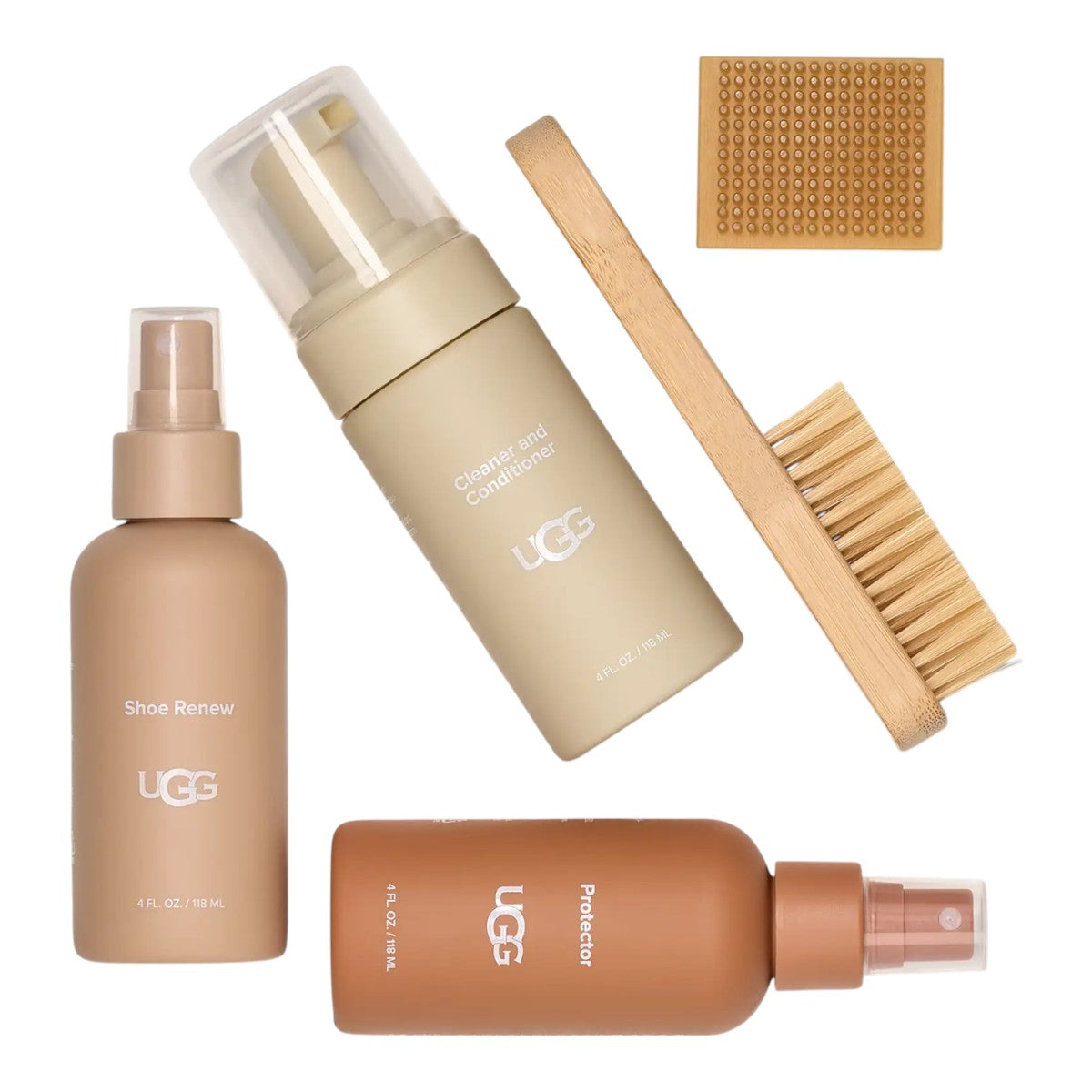 Our Care Kit includes everything you need to clean and protect your UGG sheepskin boots, shoes, and slippers. This cleaning set includes the Protector, Cleaner & Conditioner, Shoe Renew freshener, a bamboo handle brush, and a suede scuff eraser. UGG Sheepskin Protector is a water-and-stain repellent spray that protects your shoes from the elements. For existing wear, our Cleaner & Conditioner rejuvenates sheepskin, while Shoe Renew freshening spray eliminates odor. Brushes and scuff erasers keep the finish fresh and clean