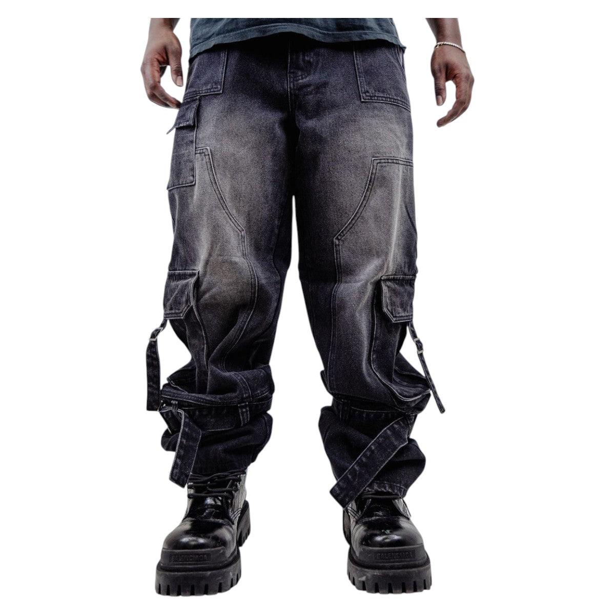 Black cargo jeans with a baggy streetwear silhouette and utilitarian pockets.