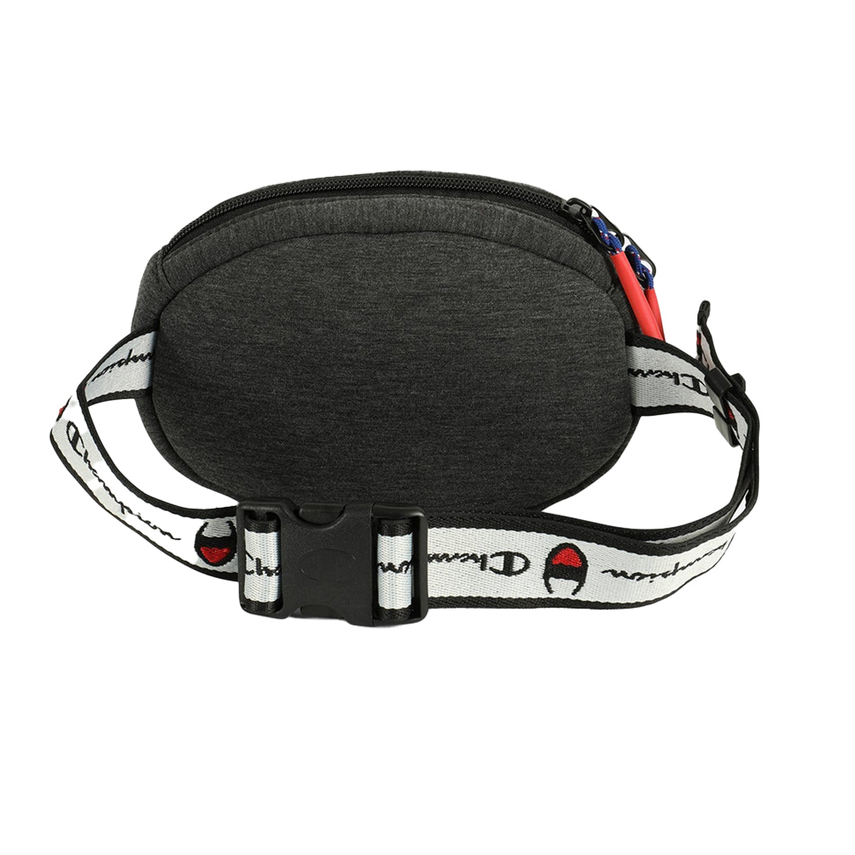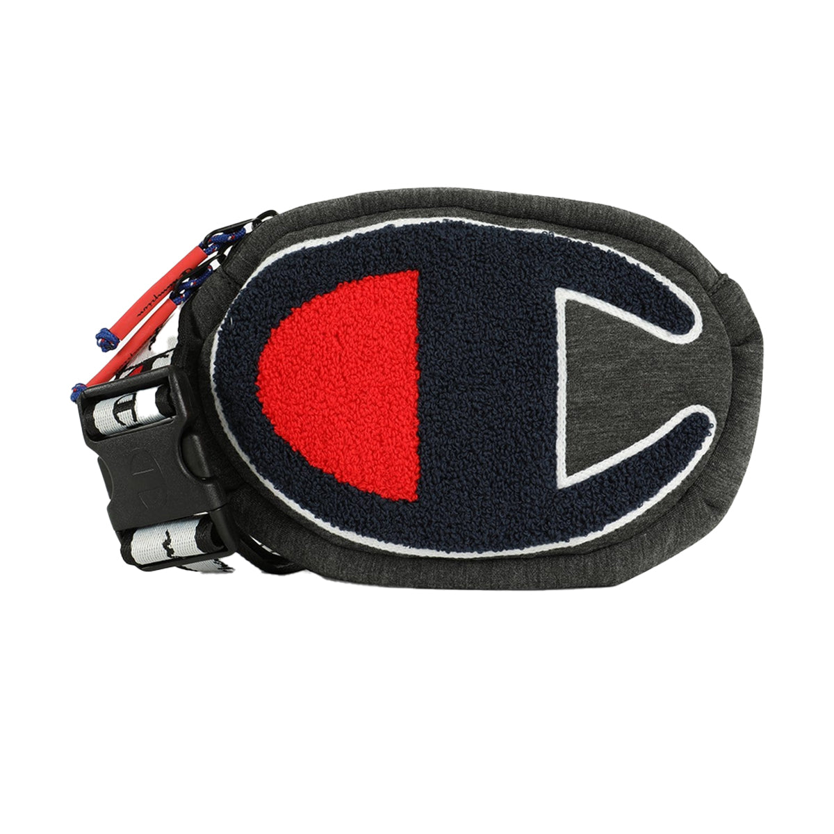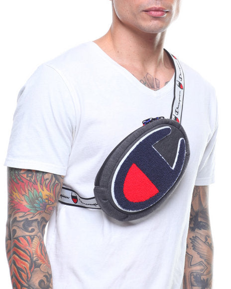 Champion Prime fanny pack. Features a large chennile knit Champion patch on front. Main compartment includes interior zip pocket. Two way zip closure. Adjustable webbed waist strap features allover Champion logos. Plastic buckle closure. Approx. dimensions: 8.25" x 5.5" x 2".