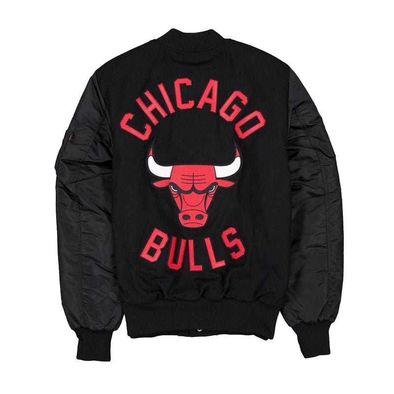 The Alpha Industries X Chicago Bulls MA-1 Bomber Jacket features embroidered Bulls patches throughout the chest and right-wear sleeve with embroidered applique team wordmark and logos at the rea